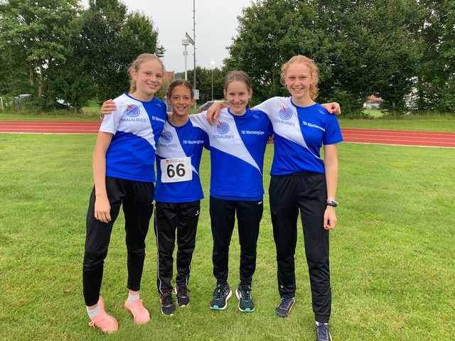 Kreismeisterin der 100m Hürden der Altersklasse U18 wurde Elle Wiedemann mit persönlicher Bestzeit von 17,40sec. Der zweite Titel ging an Julia Vogtmann, deren 4kg Kugel bei 10,28m landete. Auch Antonia Wiedemann war nach langer Wettkampfpause wieder dabei und startete bei den Frauen im Weitsprung und wurde mit 4,44m fünfte. Die 13-jährigen Mädchen Jule Beck, Ida Köhnlein und Jessica Rauter starteten als einzige LG-Athletinnen bei den Schwäbischen Meisterschaften der Blockwettkämpfe. Bei diesem Fünfkampf mit den Disziplinen Sprint, Weit, Hoch, Hürden und Speerwurf zeigten sie ihre Vielseitigkeit und platzierten sich im Mittelfeld. Ein Wochenende später ging es für die drei nach Neusäß. Dort ergatterte sich Jessica Rauter im Speerwurf mit persönlicher Bestleistung von 24,21m den begehrten Kreismeister-Wimpel. Im Hochsprung wurde sie mit 1,28m Vizemeisterin und steigerte ihre Zeit der 60m Hürden auf 11,23sec. Auch Ida Köhnlein konnte ihre Leistungen des letzten Wettkampfes steigern und freute sich über Platz drei im Ballwurf und knackte im Weitsprung die Viermeter-Marke mit 4,04m. Als Abschluss der Wettkampfpause während der Sommerferien nutzen die Sportlerinnen das Abendsportfest in Horgau. Hierbei konnte Jessica Rauter ihre 75m Zeit auf 10,96sec. verbessern und die 11-jährige Emilia Schmid überquerte die Ziellinie mit persönlicher Bestzeit in 3:06,19min der 800m Distanz.